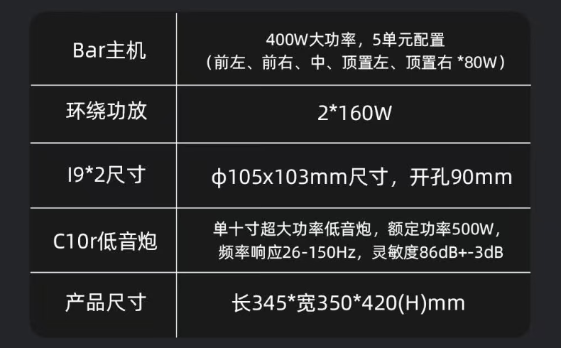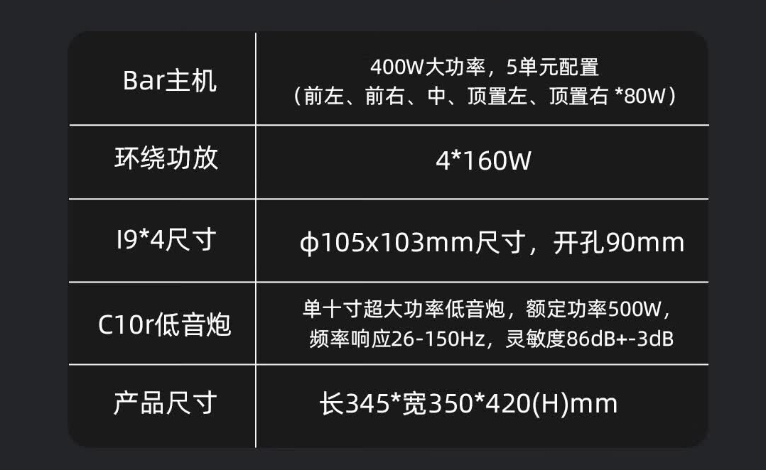 单10寸进口喇叭单元+8寸被动辐射器,大功率长冲程架构,500瓦最大输出功率下限26Hz,是力度与速度的平衡体,采用行进美国ti的DSP芯片。